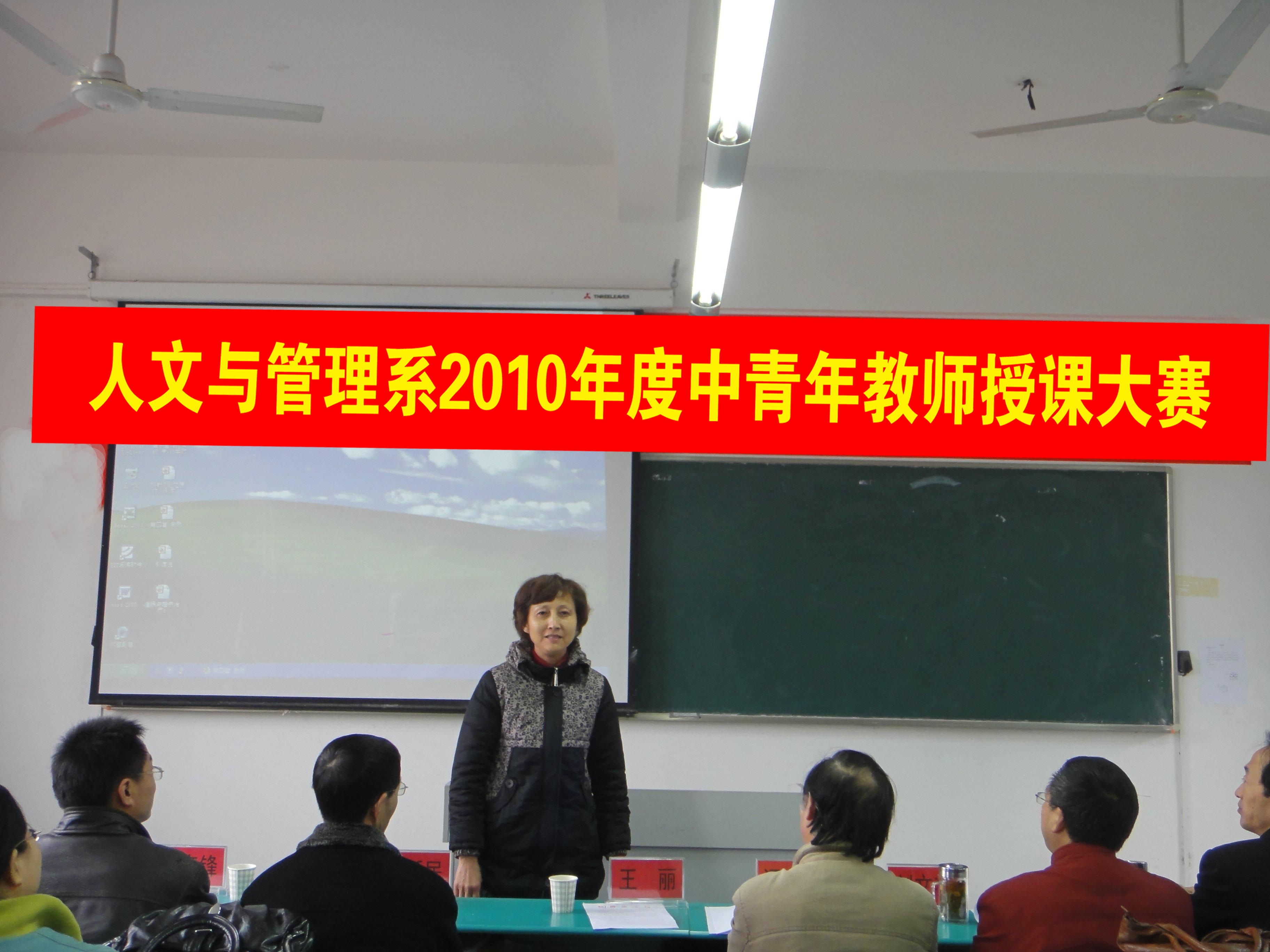 人文与管理系45周岁以下的专兼职教师参加了此次比赛。比赛以集中讲课的方式进行,重点考评教师的风范、知识面、教师的基本素质和能力、授课的方式、方法、技巧等,以 PPT兼板书相结合的方式进行。