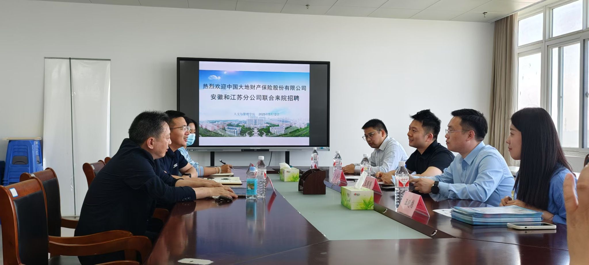 为加强与用人单位的联系,搭建毕业生与用人单位的交流平台,5月12日,太阳集团tyc9728邀请中国大地财产保险股份有限公司安徽分公司和江苏分公司来院选用毕业生,公司党委副书记钱彬彬、保险学专业负责人俞彤以及相关辅导员参加会议。