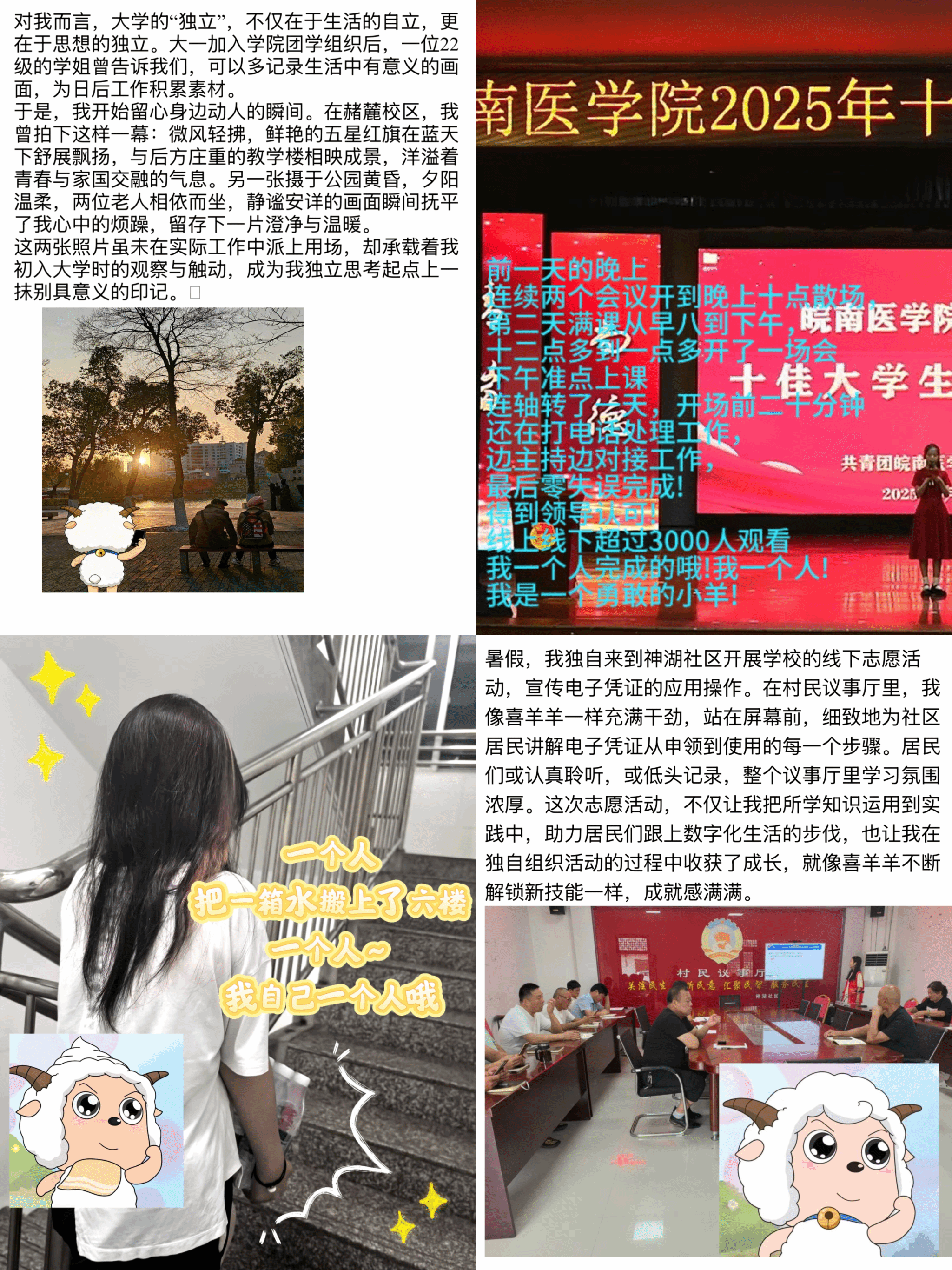 为了鼓励员工记录和分享大学期间从依赖走向独立的成长历程,太阳集团tyc9728于9月26日至10月2日面向全院员工开展“小羊成长记·我的独立图鉴”图文征集活动,活动旨在记录同学们离开家乡、开启老员工活后的成长历程,包括独立适应校园生活、独自就医、参与志愿服务、投身科技项目等多方面经历。这些点点滴滴的成长印记,如同一只只小羊离开母羊庇护、逐渐独立的过程,展现了当代老员工在陌生环境中勇敢前行的精神风貌。