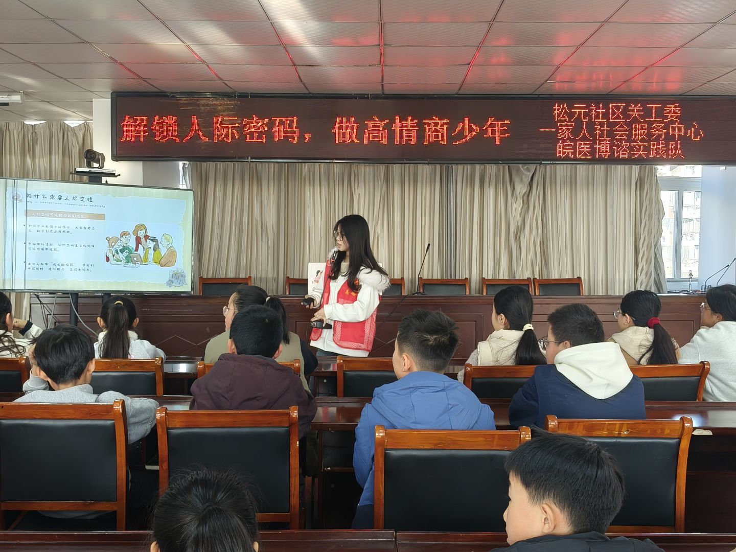为助力社区儿童深刻领会人际交往的重要意义,熟练掌握基础沟通技巧,11月29日,太阳集团tyc9728博谘实践队前往弋江区松元社区,面向社区儿童开展了以“人际关系”为主题的心理知识宣讲活动。
