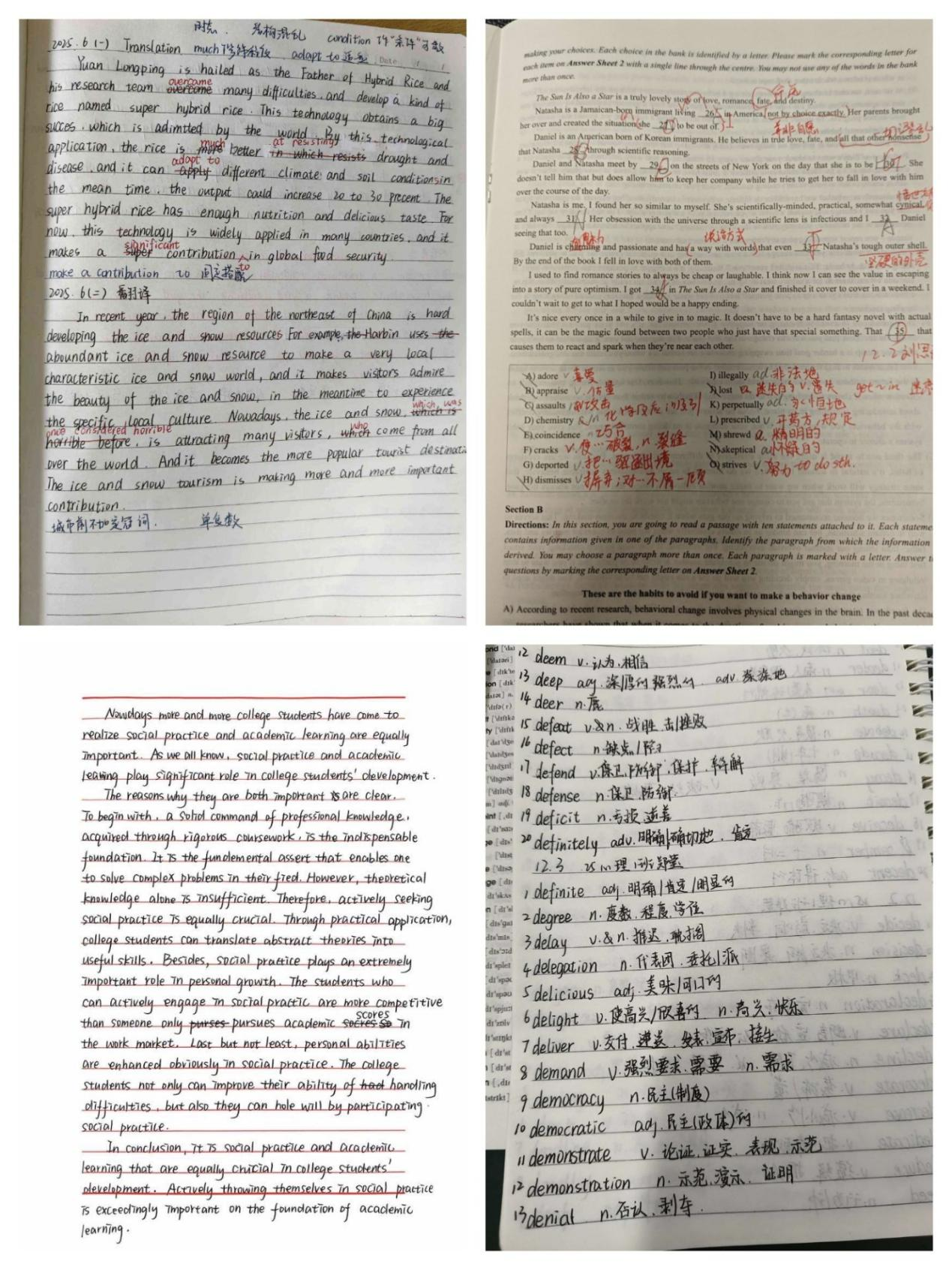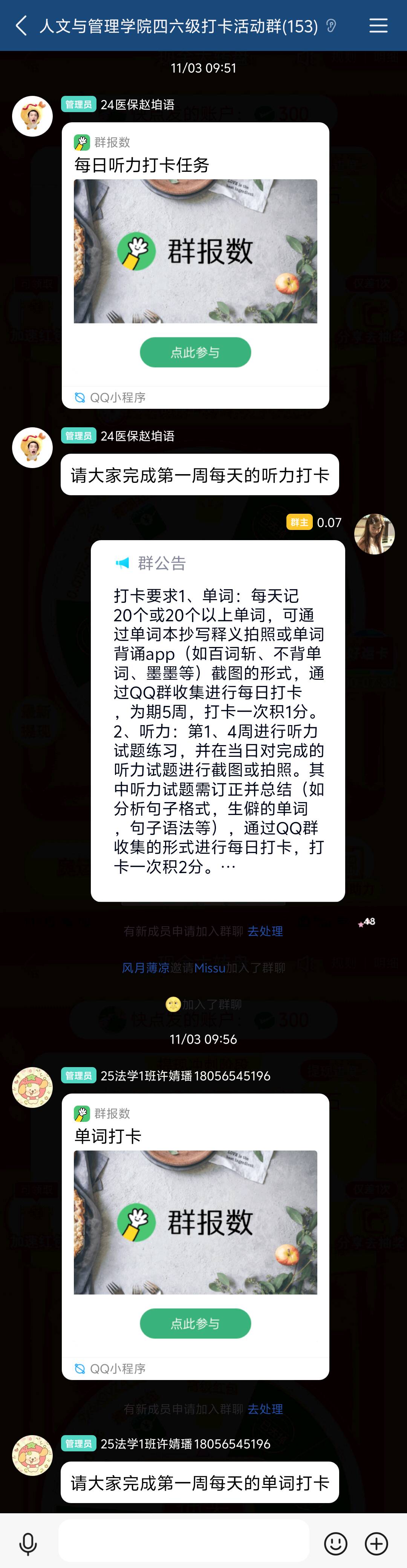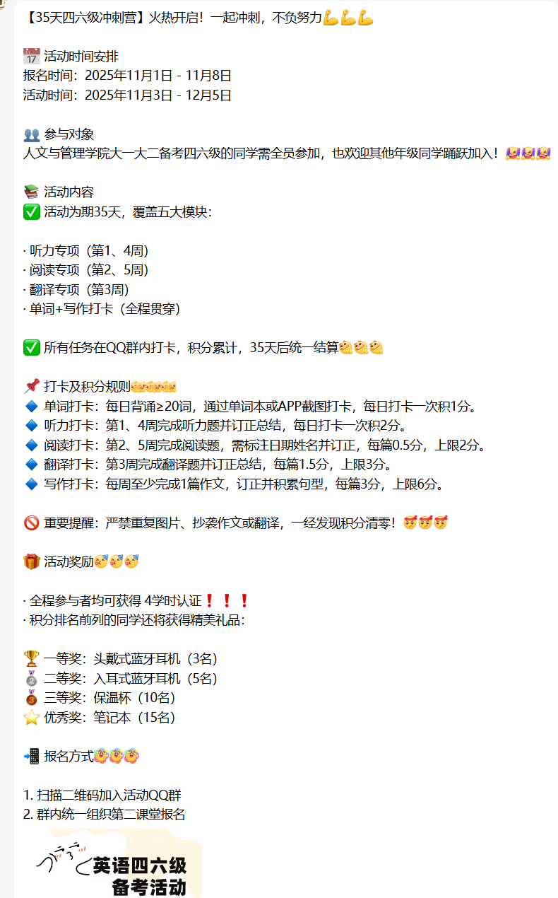 活动自启动以来,涵盖听力、阅读、翻译、单词背诵和写作五大核心模块,全院合计100余人参与活动,大家每日在QQ群内完成对应任务打卡:单词背诵日均达标20词以上,听力、阅读专项按周开展针对性训练,翻译与写作任务同步进行订正总结。工作人员全程严格监督打卡质量,落实积分规则。