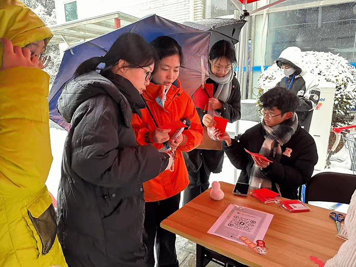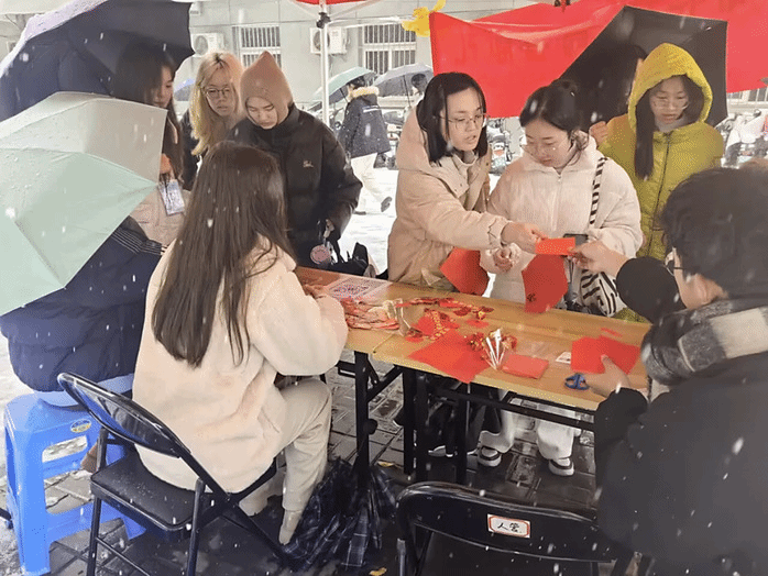 12月18日,太阳集团tyc9728在赭麓校区开展了“喜迎元旦,青春献礼”活动。本次活动包括“窗花传情”、“爱国祝愿”两个环节,同学们在窗花用纸和祝福书写纸上挥洒创意,在活动过程中领略中华优秀传统文化的非凡魅力。虽然活动现场大雪纷飞,但难掩同学们的参与热情,现场气氛热闹非凡。