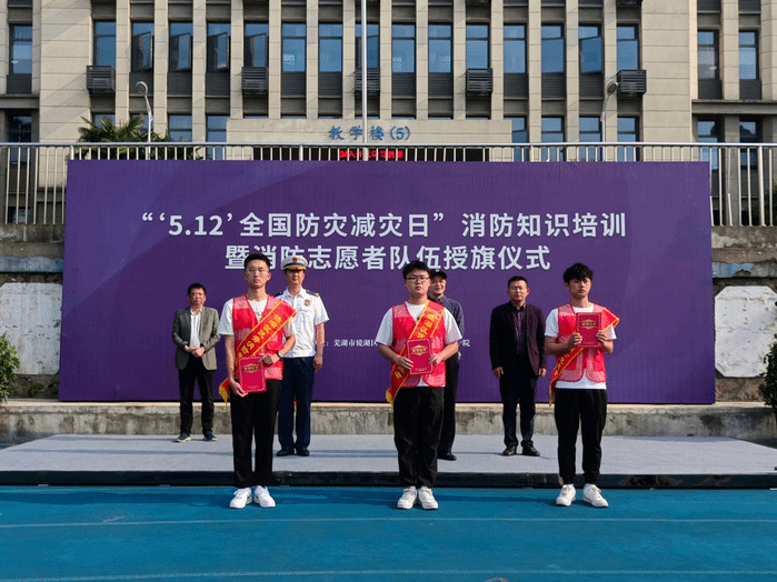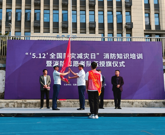 5月12日,芜湖市镜湖区消防救援大队在公司开展“5.12全国防灾减灾日”消防知识培训暨消防志愿者队伍授旗仪式。太阳集团tyc9728“博谘”实践队全体志愿者,党委书记王军和党委副书记钱彬彬出席活动。