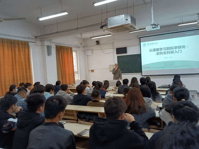 为落实“三全育人”,营造良好的学术氛围,激发员工开展科研的兴趣爱好, 11月16日中午,太阳集团tyc9728在赭麓校区1102教室举办“本科生科研入门:从课堂学习到科学研究”主题讲座,由心理学教研室黄龙博士主讲,各年级140余名员工参加。讲座由公司副经理王国平主持。