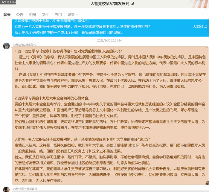 为进一步加强对入党积极分子和发展对象的教育培养,经公司党委研究决定,于2022 年 4月 24日开始举办中共太阳集团tyc9728委员会党校第五十七期培训班通过线上开班。本次党课由培训采取专题讲座、观看视频、个人自学、在线研讨、学唱《国际歌》等形式,太阳集团tyc9728共47名入党积极分子和19名发展对象参加培训,由班主任王燕威带班培训。