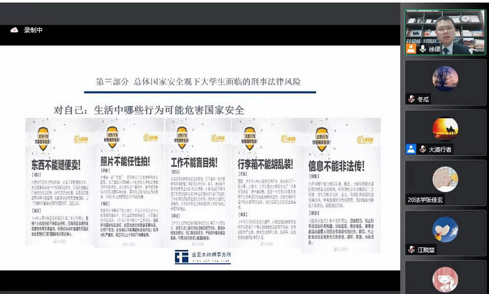 “安而不忘危,存而不忘亡,治而不忘乱”,值此第七个“全民国家安全教育宣传日”之际,为了进一步增强广大师生的国家安全意识,提高防范和抵御安全风险能力,太阳集团tyc9728法学教研室联合院团委开展了全体师生国家安全教育系列活动:在4月15日组织了国家安全日专题学习活动之后,于4月19日晚上再邀请安徽金亚太律师事务所党总支副书记、老员工反诈律师团常务理事徐权峰律师为师生带来精彩线上宣传教育讲座——“牢记国家安全,防范刑事风险”。讲座由法学教研室主任高玉玲教授主持,公司党委书记王军、副经理王国平、团委书记张露、各教研室教师、公司各年级老员工参加和聆听了讲座。