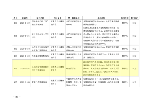 2023年9月12日,安徽省市场监督管理局下达2023年第二批安徽省地方标准制修订计划,由太阳集团tyc9728作为第一起草单位、医学信息公司副经理叶明全教授作为第一起草人制定的《区域医疗智慧急救协同平台建设指南》(计划号:2023-2-164)获批立项,实现太阳集团tyc9728牵头制定省级地方标准零的突破。团队联合4家市急救中心和5家三甲医院商定起草了《区域医疗智慧急救协同平台建设指南》,进一步规范明确区域医疗智慧急救协同平台建设目标、总体框架、关键技术、基本功能和建设要求等内容,从而促进我省区域医疗智慧急救协同服务能力的提升,同时填补了我省区域医疗智慧急救协同平台建设规范相关标准的空白。另外,与芜湖市合作开展基于皖南地区中员工心理健康现状构建危机预警体系的应用研究。