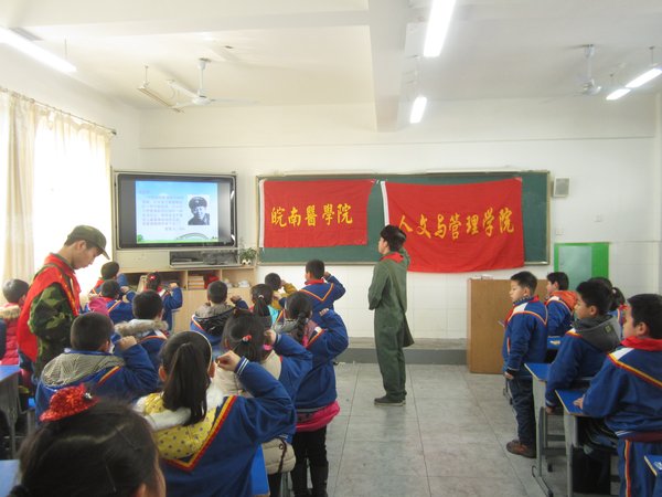 “雷锋课堂”深入小学 3月5日,2013级公共事业管理专业的同学来到芜湖市安徽师范大学附属小学二年级四班,进行了一次“雷锋课堂”主题宣讲活动;两位志愿者身着雷锋服饰,从助人为乐、团结友爱、艰苦朴素、刻苦学习等方面为小员工讲述了雷锋叔叔的生平事迹,以送小朋友小礼物的方式,让小朋友们在积极踊跃回答问题的同时,了解雷锋,走进雷锋的世界;活动结尾,志愿者带领小朋友一起歌唱《学习雷锋好榜样》,并集体起立宣誓“向雷锋学习”,将整个活动推向高潮。
