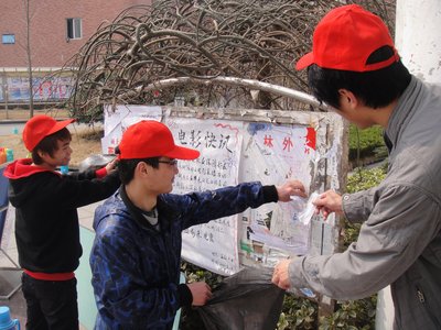 志愿者拿起小刀和抹布清理、铲除宣传栏和公共物品上的小广告,用实际行动感召老员工,美化校园,为广大师生提供更优雅和谐的学习生活环境,为文明校园的建设添砖加瓦!
