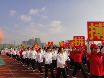 在运动会开幕式中,人文与管理系精心组织了400人的入场方阵队伍,他们用独特的创意、舞动的红旗、充满激情的口号和整齐的步伐赢得全校师生的一片喝彩声。