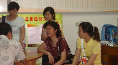 系党总支副书记刘华、系团委副书记吴映辉在村委会交流社区管理工作
