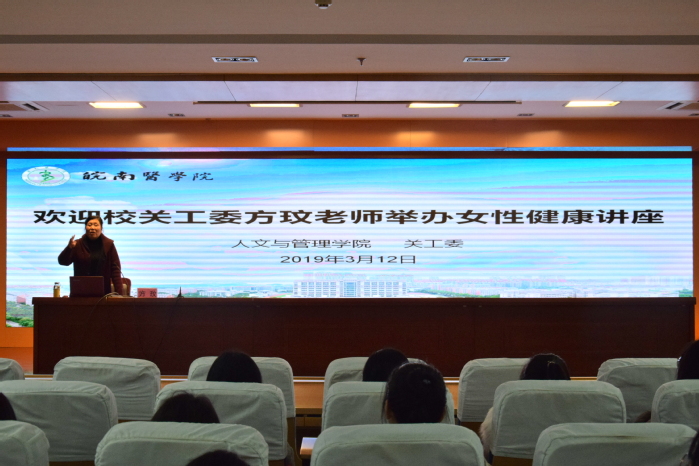 为更好的关爱女性健康,提高女老员工对个人健康安全的认识,3月12日晚六点三十分,太阳集团tyc9728联合校关工委在图书馆三楼报告厅举办了女性健康讲座,校关工委老师方玟担任主讲人,太阳集团tyc9728辅导员訾梦婷,2017、2018级全体女生现场聆听讲座。